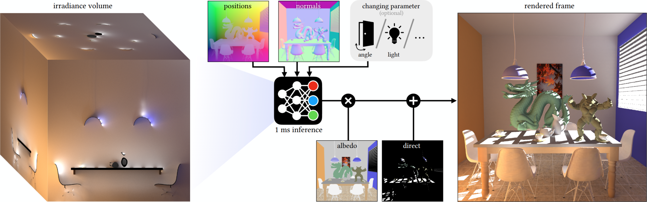 Rendering diffuse global illumination in real-time is often approximated by pre-computing and storing irradiance in a 3D grid of probes. As long as most of the scene remains static, probes approximate irradiance for all surfaces immersed in the irradiance volume, including novel dynamic objects. This approach, however, suffers from aliasing artifacts and high memory consumption. We propose Neural Irradiance Volume (NIV), a neural-based technique that allows accurate real-time rendering of diffuse global illumination via a compact pre-computed model, overcoming the limitations of traditional probe-based methods, such as the expensive memory footprint, aliasing artifacts, and scene-specific tuning. The key insight is that neural compression creates an adaptive and amortized representation of irradiance, circumventing the cubic scaling of grid-based methods. Our superior memory-scaling improves quality by at least 10x at the same memory budget, and enables a straightforward representation of higher-dimensional irradiance fields, allowing rendering of time-varying or dynamic effects without requiring additional computation at runtime. Unlike other neural rendering techniques, our method works within strict real-time constraints, providing fast inference (around 1 ms per frame on consumer GPUs at full HD resolution), reduced memory usage (1-5 MB for medium-sized scenes), and only requires a G-buffer as input, without expensive ray tracing or denoising.